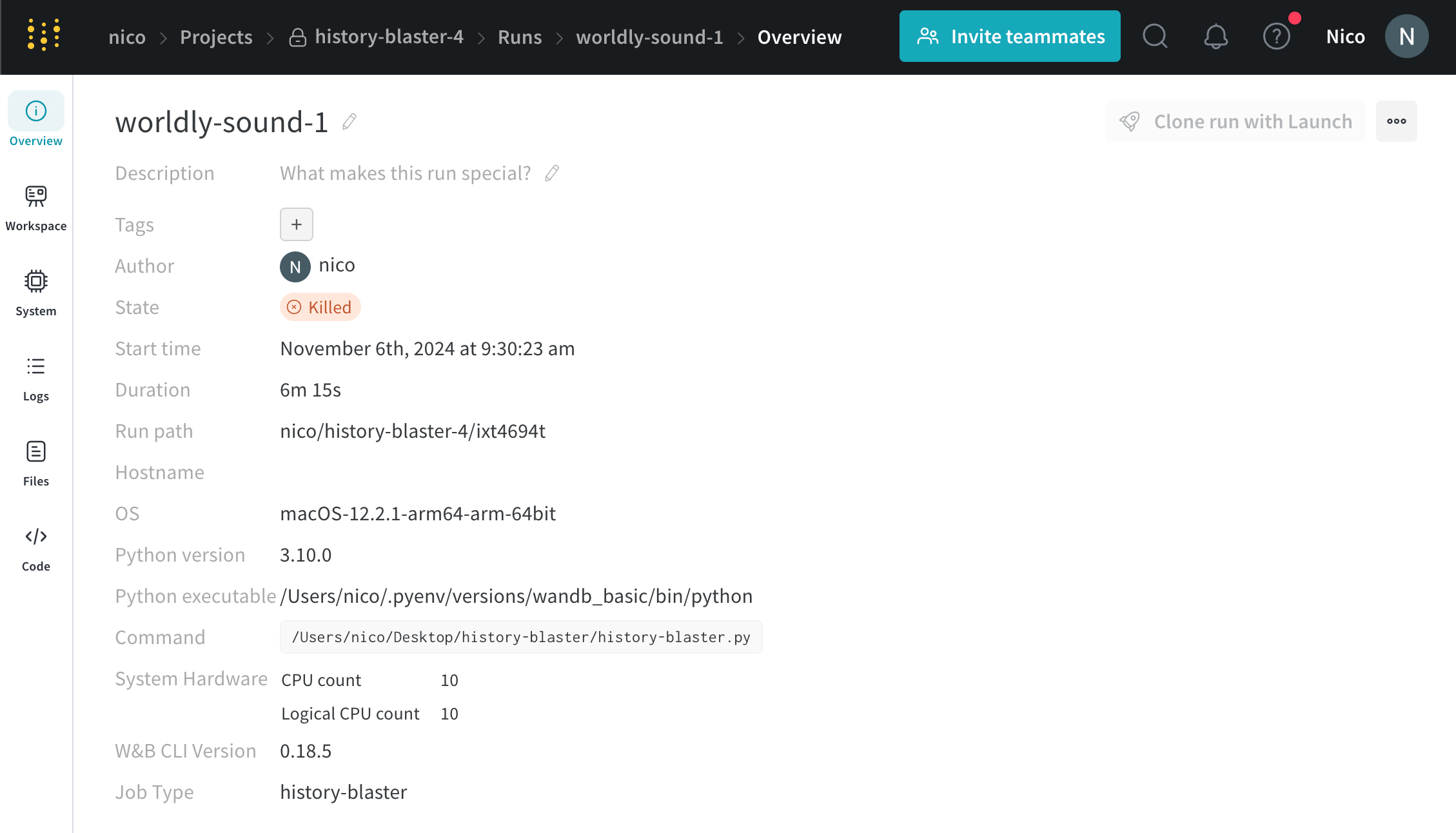 • Host name: W&B が run を計算する場所。ローカルマシンで run を初期化した場合、マシンの名前が表示されます。