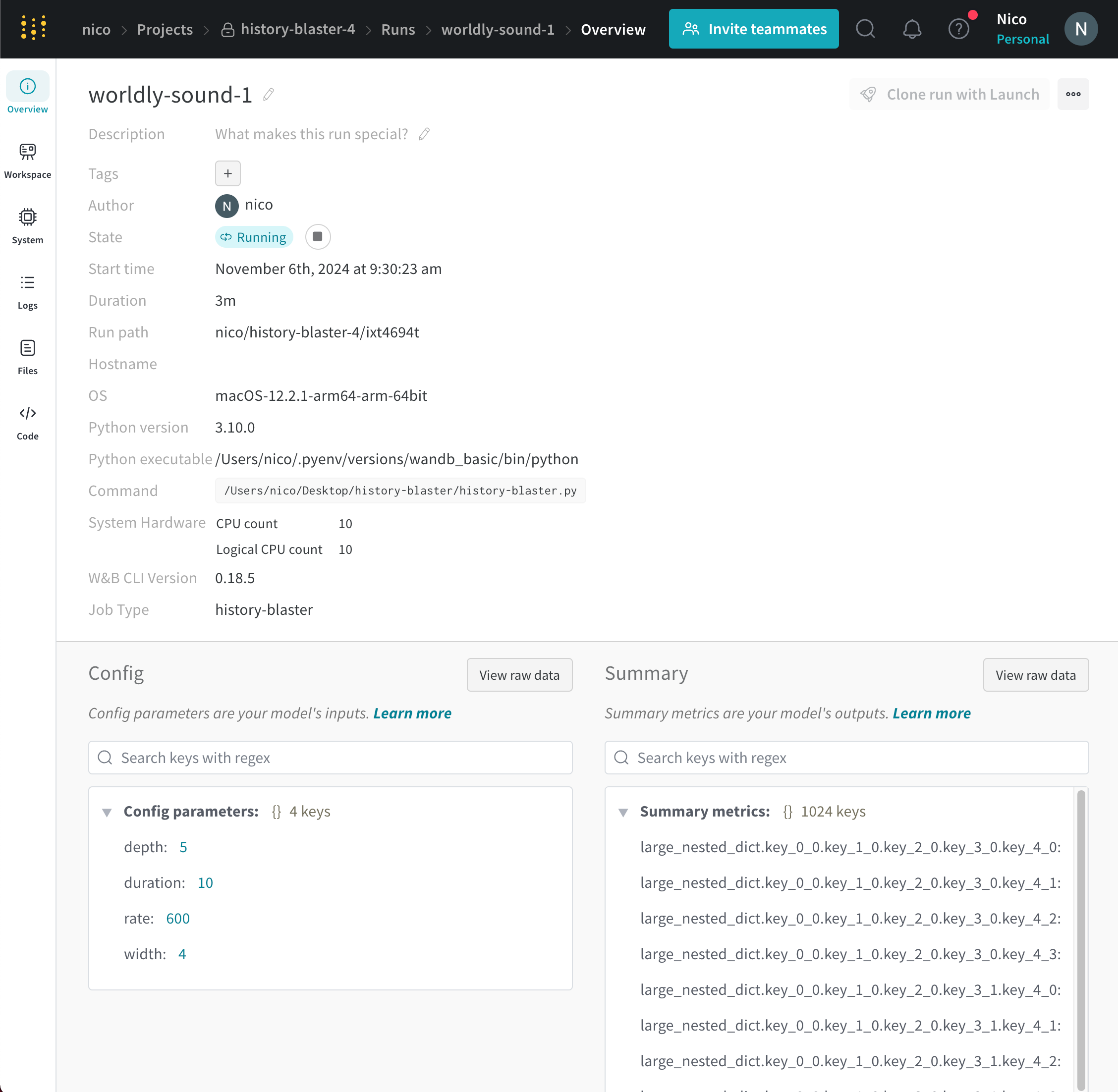 run の状態、run にログ記録されたアーティファクト、run 中に記録されたログファイルなど、特定の run に関する情報を表示します。